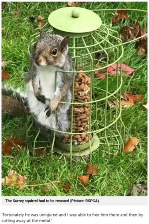 鳥の給餌器にはまったリス「ナッツの食べ過ぎ? 」と同情と笑いを誘う(英) 鳥の給餌器に入り込んでしまったリスがすっぽりとケージに挟まり、身動きが取れなくなっているところを発見され、英国動物虐待防止協会(RSPCA)に救助された。 リスは
